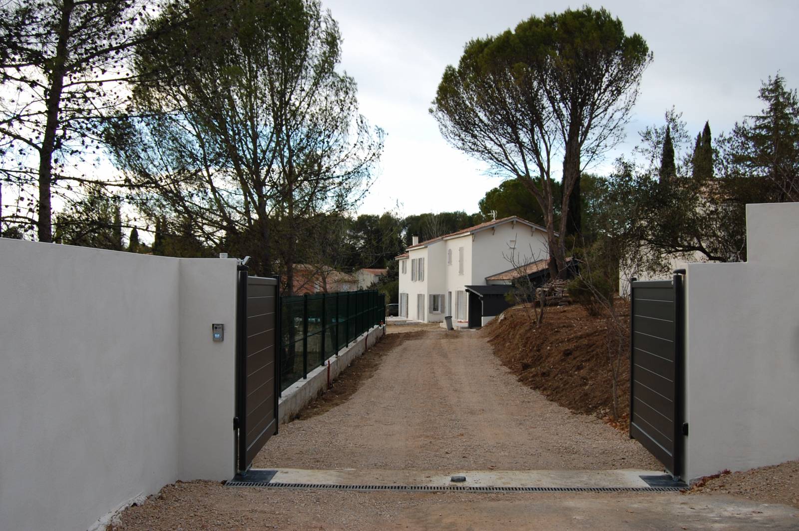 Pour le portail ouvrant à deux vantaux, nos clients souhaitaient faire installer une motorisation la plus discrète possible. En travaillant en bonne entente avec le maçon et l'électricien, nous avons donc pu prévoir une motorisation enterrée. Notez qu'il est également possible d'installer une motorisation à bras ou à vérins, selon vos besoins.