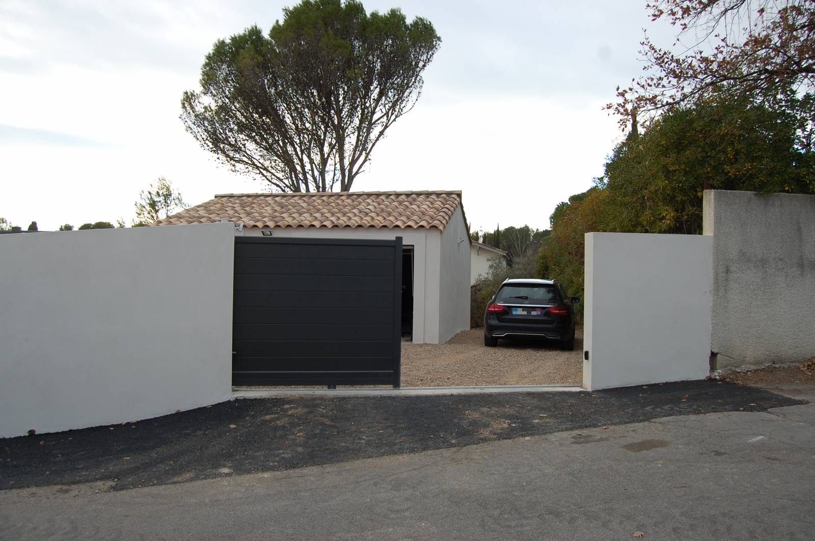 Pour fermer l'accès à votre parcelle, les solutions sont multiples selon votre configuration. Dans ce cas précis, à Saint-Clément de Rivière, à côté de Montpellier, Navy menuiseries a installé deux portails motorisés en aluminium de coloris Noir 2100, assorti aux menuiseries de la construction.